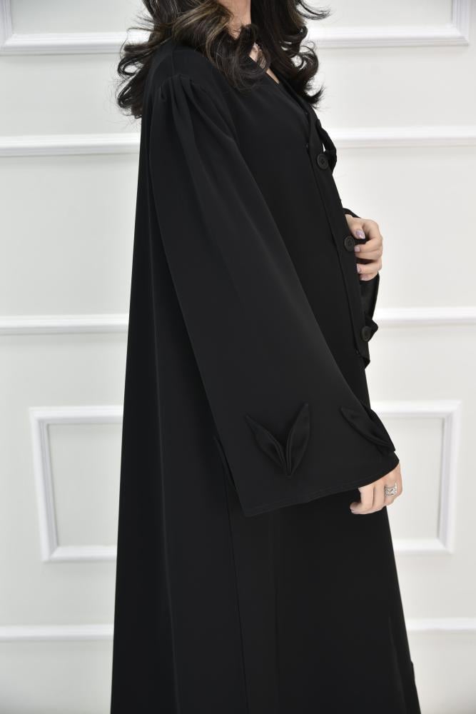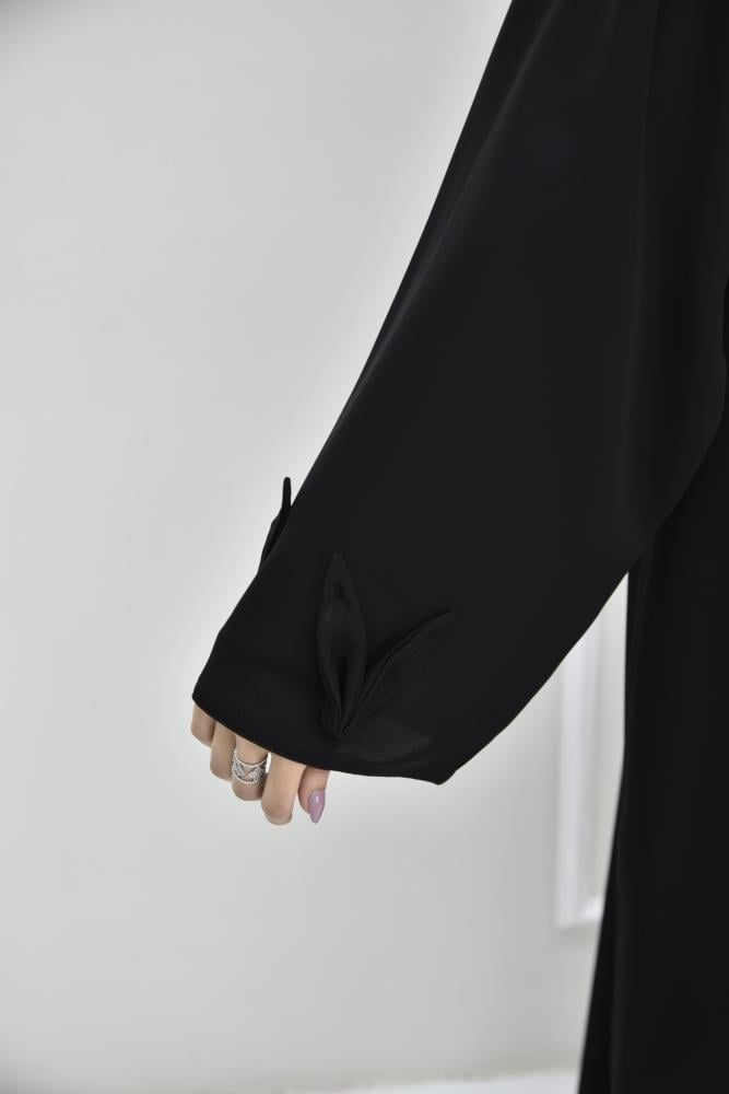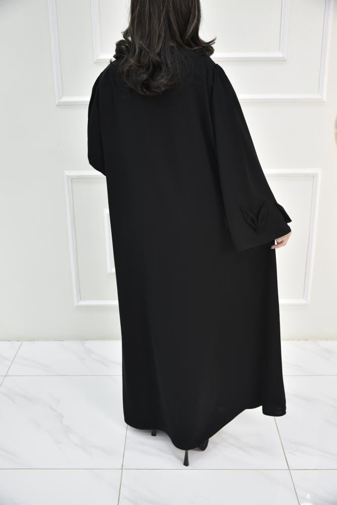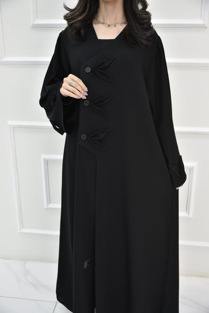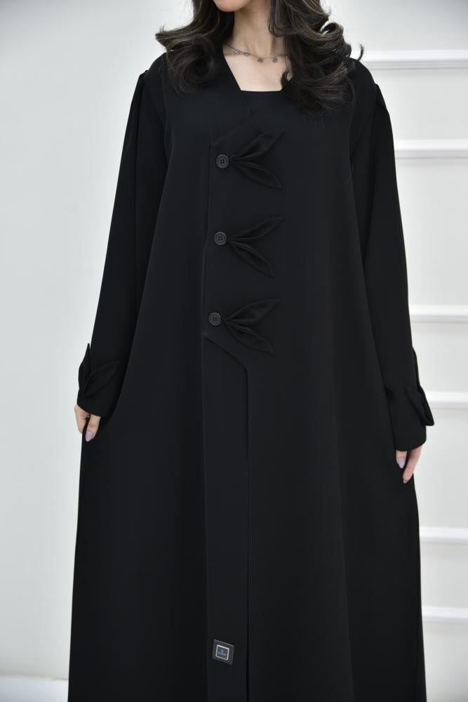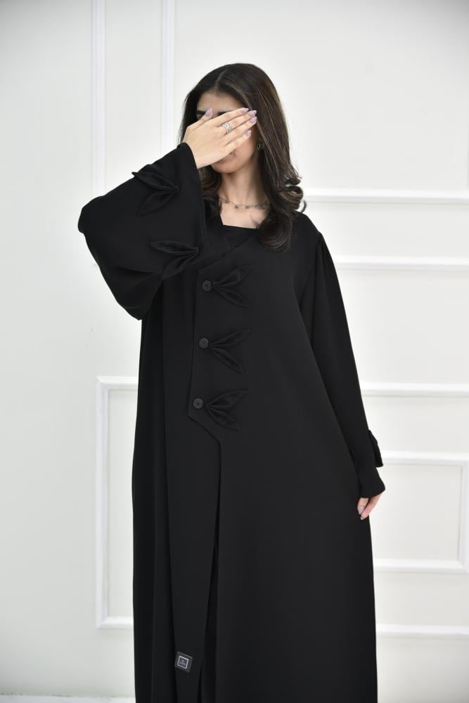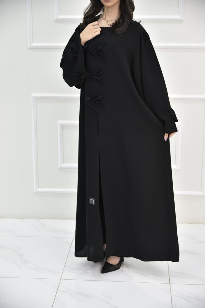 عباية ناعمة مصممة من قماش "نواعم بلاس" الفاخر، تبرز بتفاصيل أنثوية راقية من خلال 3 طقطق على شكل فيونكات في الأمام، مع تنسيق أنيق لفيونكات مماثلة على الأكمام المربعة. تصميم يجمع بين النعومة والأنوثة لإطلالة مميزة.