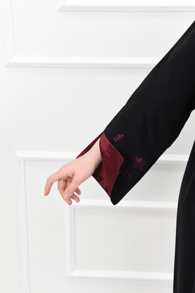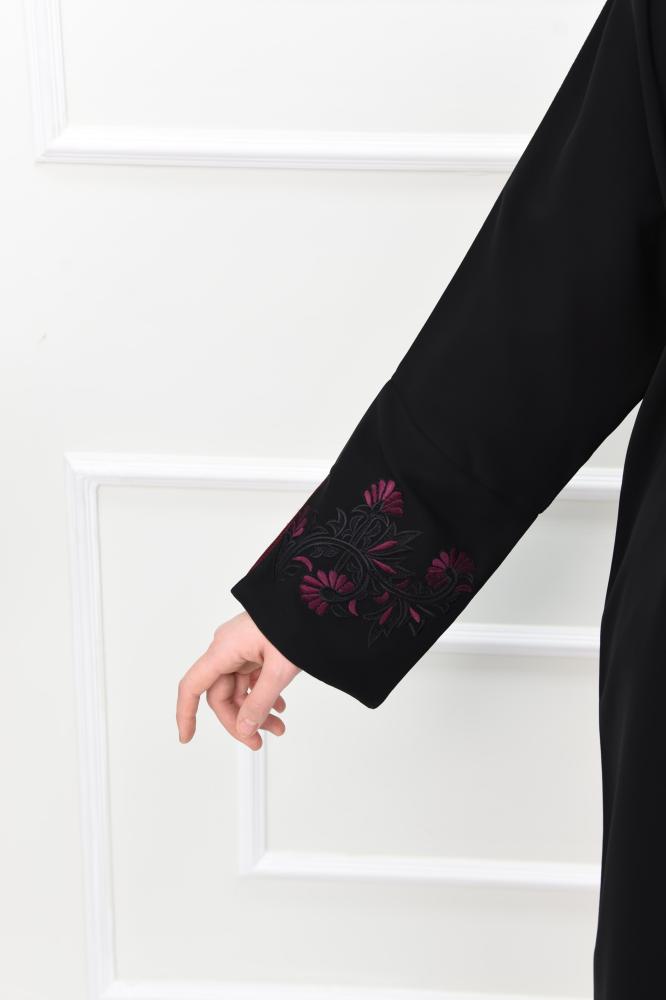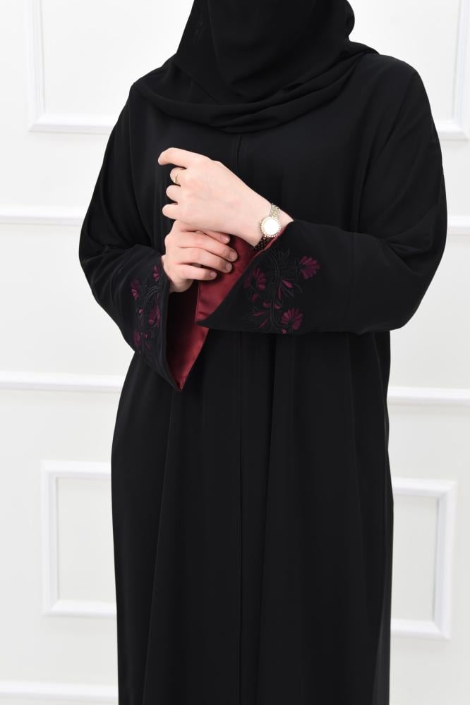 هذه العباية تتميز بتصميم راقٍ وعصري يلفت الأنظار. تأتي باللون الأسود الكلاسيكي، ميزينه باكمام تطريز يدوي داكن مما يضي لمسة من الأنوثة والجاذبية. الأكمام طويلة بتصميم واسع ومريح، وتجمع بين الأناقة والراحة. العباية مزودة بأزرار أمامية، مما يسهل ارتداؤها ويضيف لمسة عصرية.