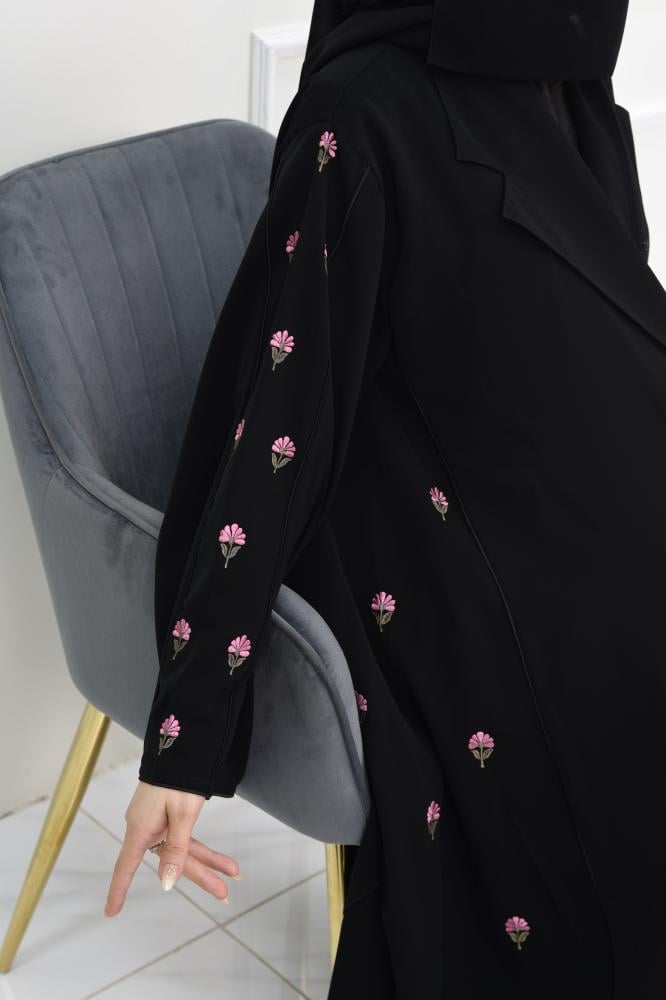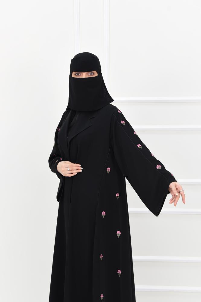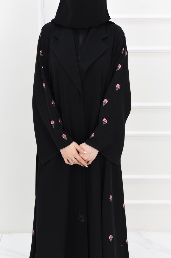 "عباية أنيقة مفتوحة مع طقطق وورود مطرزة، قماش ناعم وياقة بالصدر."