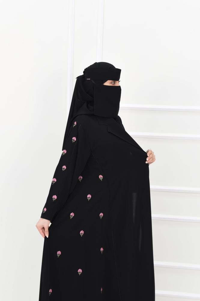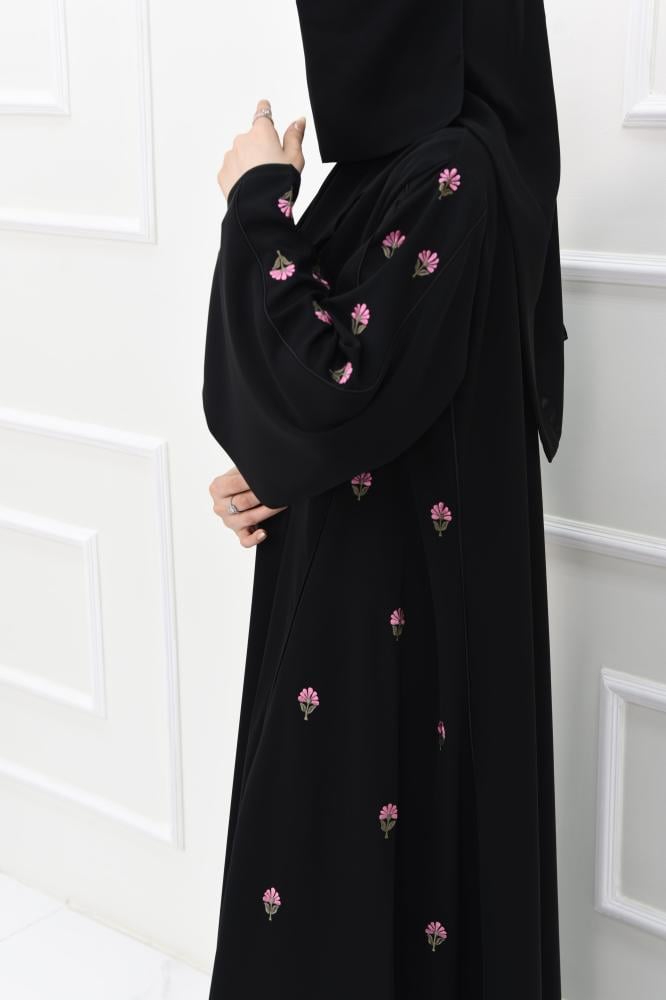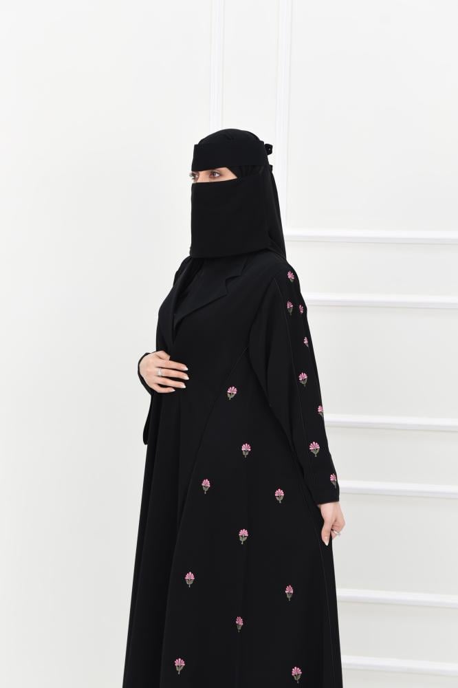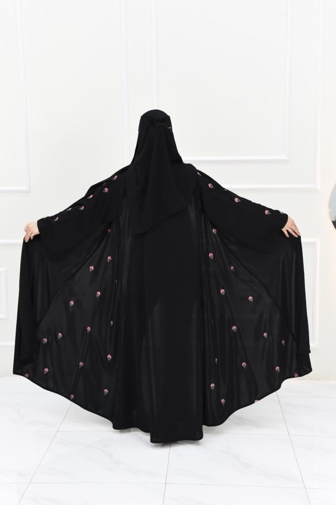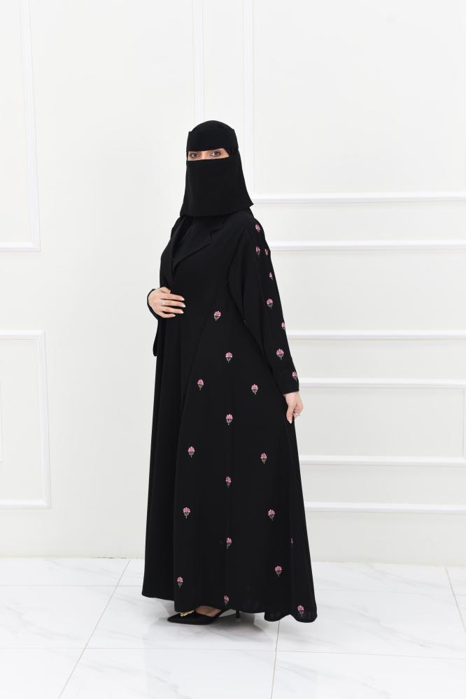 - وصف كامل: "عباية أنيقة بتصميم أماراتي مفتوحة مسكرة بطقطق، مطرزة بتشكيلة ورد، يتميز التطريز على الجانبين وعند الأكتاف بشكل ورد راقي. مصنوعة من قماش ناعم، مثالية للمناسبات الخاصة